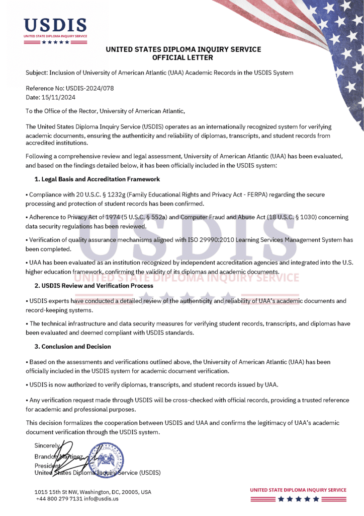 The University of American Atlantic (UAA) has been officially included in the United States Diploma Inquiry Service (USDIS) system following a comprehensive legal and institutional evaluation. This inclusion authorizes the verification of diplomas, transcripts, and student records issued by UAA through USDIS. The process confirmed compliance with international standards such as FERPA, the Privacy Act, and ISO 29990:2010. Verified by USDIS experts, UAA’s data security and academic documentation systems meet all required criteria. This partnership strengthens the global credibility and authenticity of UAA’s academic documents.