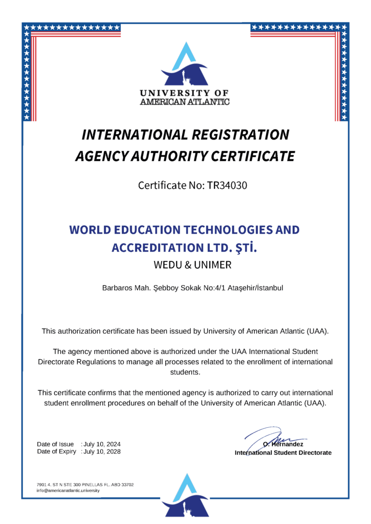 We are proud to announce that we are officially authorized by the University of American Atlantic (UAA) to manage all processes related to the enrollment of international students. This certification affirms our ability to facilitate the registration of students at UAA, ensuring a seamless and efficient process for those looking to study at this prestigious institution.