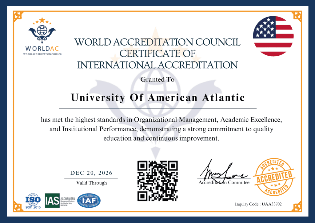 The University of American Atlantic (UAA) has been officially granted international accreditation by the World Accreditation Council (WORLDAC). This recognition confirms that UAA meets the highest global standards in organizational management, academic excellence, and institutional performance. The accreditation reflects UAA’s ongoing commitment to delivering quality education and fostering continuous improvement in all areas of higher learning.